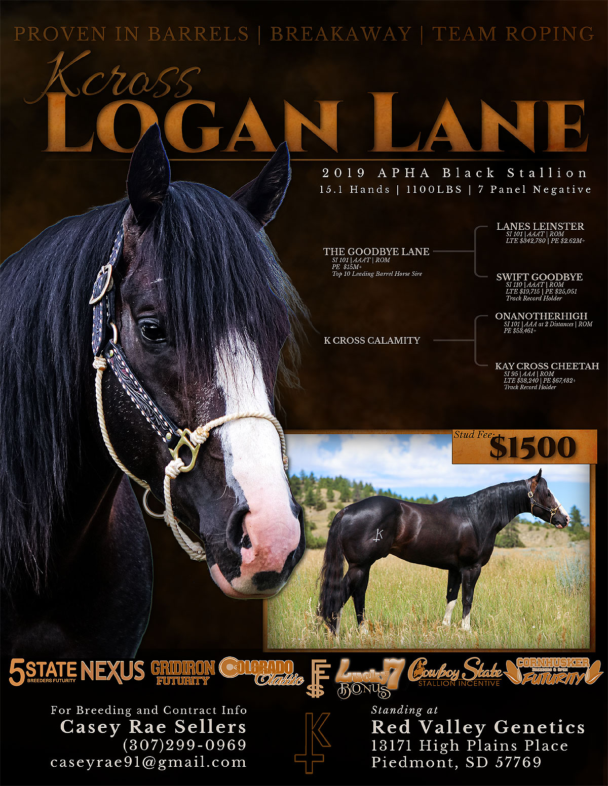 Kcross Logan Lane is a 2019 homozygous black stallion that represents the balance of proven pedigree, versatility, and usability we believe matters most. He is sired by the record-breaking sire The Goodbye Lane and out of K Cross Calamity, a mare whose foundation traces to the influential genetics of On A High—bloodlines known for speed, grit, and longevity. With over $16,000 in earnings, Logan Lane has proven himself across heading, breakaway roping, and barrel racing, showcasing athleticism and adaptability in multiple arenas. His ability to compete successfully in diverse disciplines reflects both his physical ability and his trainable, willing nature. Logan Lane has been extensively ranched on, contributing to his soundness, durability, and excellent disposition. He is well-balanced, correct, and built to withstand real work, with a quiet, honest mindset that makes him a pleasure to be around and ride. Combining respected bloodlines, demonstrated performance, and a steady, reliable temperament, Kcross Logan Lane stands as a stallion suited for breeders looking to produce athletic, trainable horses with both competitive ability and longevity. Incentives include: Cornhusker Futurity, Cowboy State Stallion Incentive, Colorado Classic,5-State Breeders Futurity, Lucky 7 Bonus, NEXUS, Gridiron Futurity, and Future Fortunes.