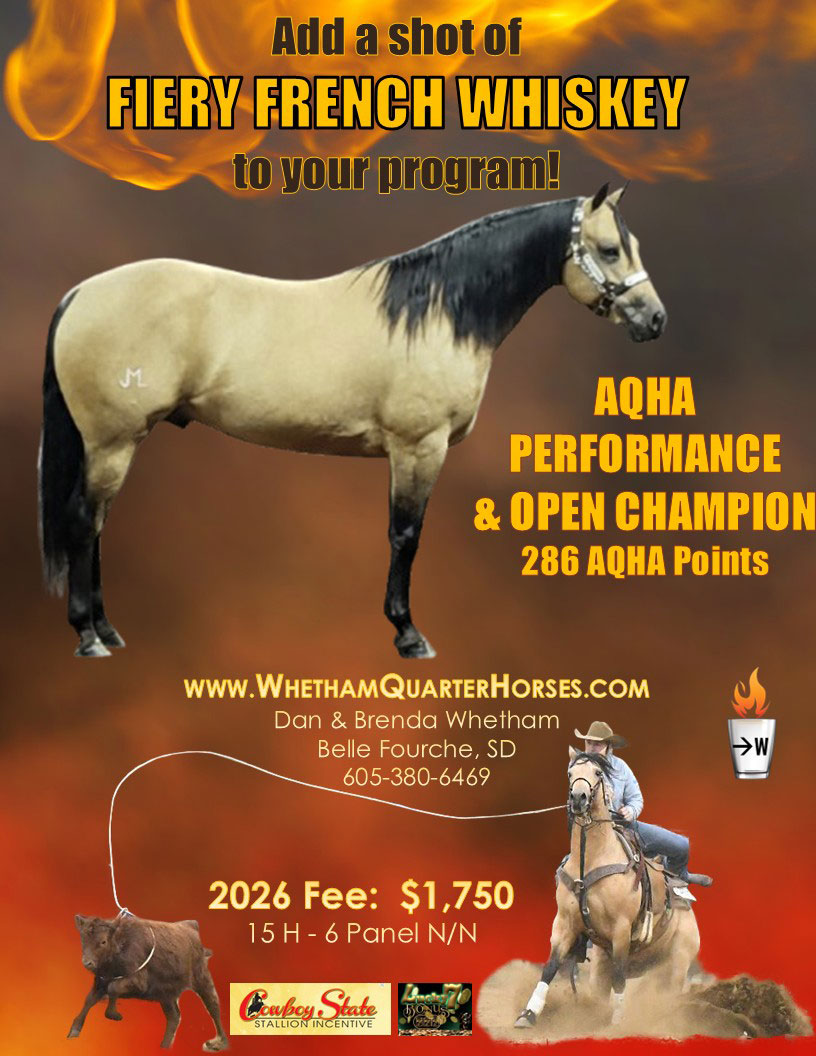AQHA Performance and Open Champion with 286 points. One of only seven stallions in the past 10 years that have earned superior ratings in Heading, Heeling and Tie-down. Fiery French Whiskey was the Best of the West Tie-down Futurity Champion during the Black Hills Stock Show in 2021 and 2022. He was Grand Champion Halter at the BHSS in 2022 and 2024. He was the All-Around Champion at the BHSS in 2023, 2024 and 2025. Multiple top 10 finishes at the AQHA World Show. Color, conformation, disposition, proven performance - he is the complete package. Here is your opportunity to raise an OWN daughter or son of an AQHA Champion. Check out the stallion page on our website for more information and multiple videos of him in action. Thank you for considering adding a shot of Fiery French Whiskey to your program. .